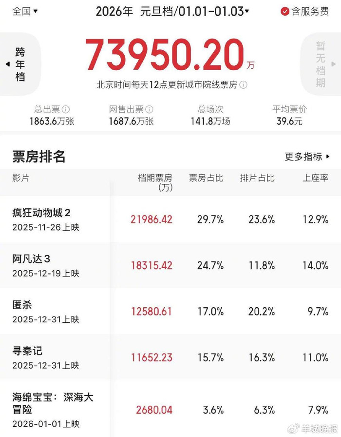 值得关注的是,广东不仅总票房领跑,观影人次与放映场次也位居全国前列。据猫眼专业版数据,广东元旦档观影人次达286.1万,放映场次超15.8万场,其中广州单市票房便达3059.27万元。这种强劲表现得益于广东完善的影院基础设施、多元的观影群体以及精准的排片策略,配合各渠道优惠票价,有效激发了基层观影需求。