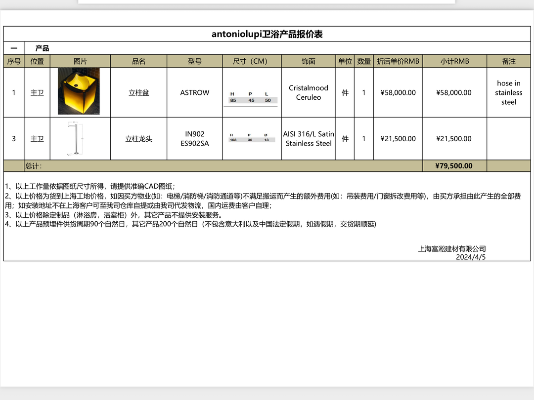 去年4月,上海市民马女士在筹备新家装修时,通过上海富淞建材有限公司购买了一款意大利AntonioLupi的树脂立柱盆(其功能为洗手池),商品价格为79500元,其中立柱盆58000元,立柱龙头21500元。