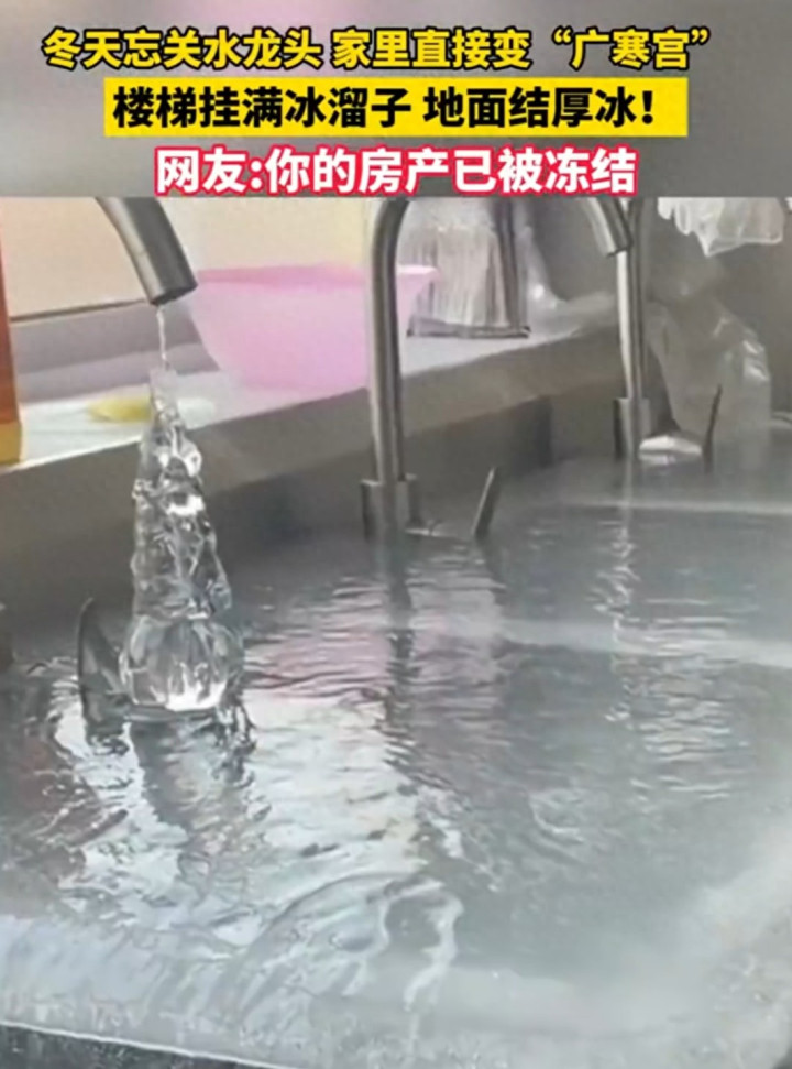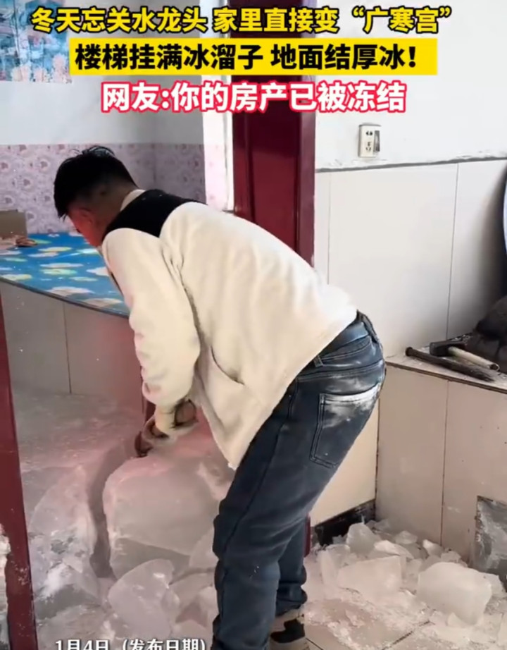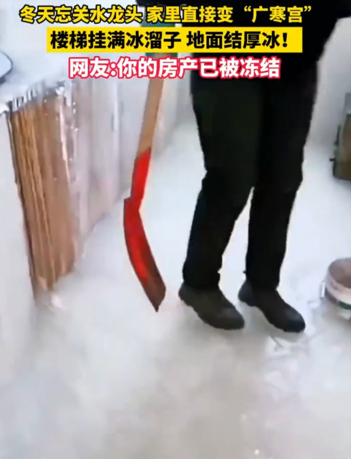 事件发生在东北地区。户主离家时的一个小小疏忽,让水龙头持续滴水。在户外动辄零下二三十度的低温里,没有暖气保护的室内温度迅速跌破冰点。
