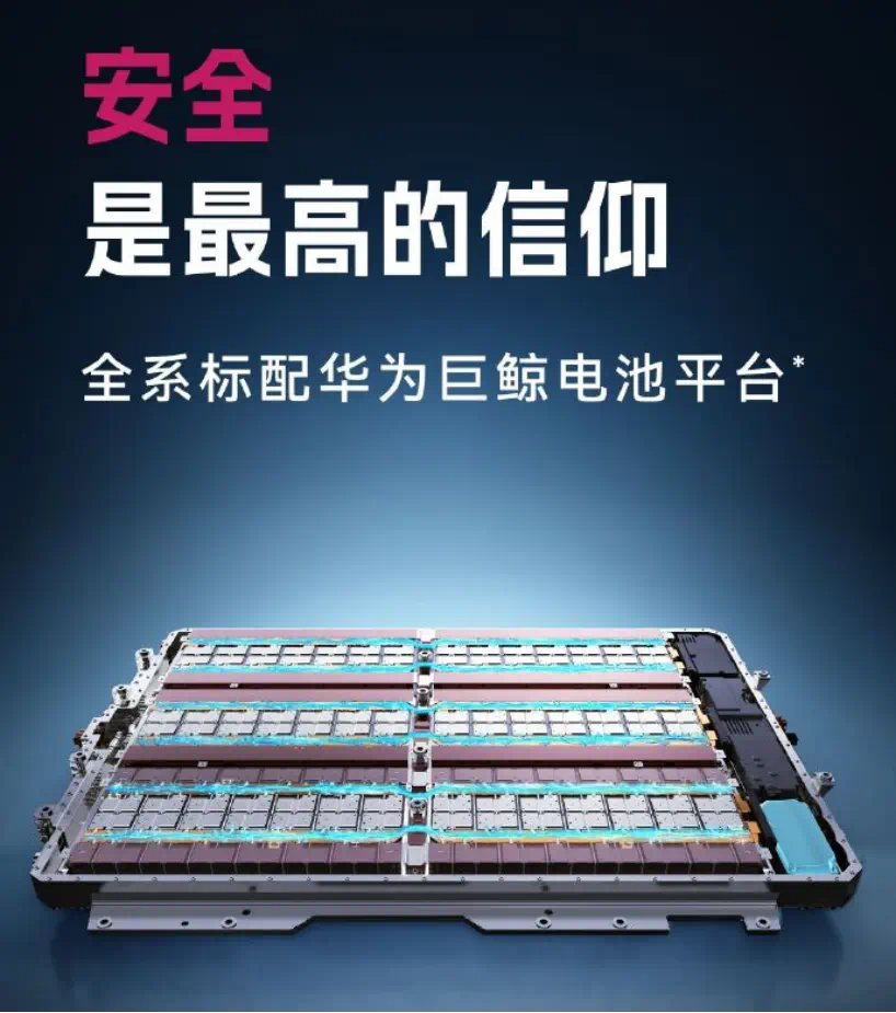 新车全系基于华为巨鲸800V高压电池平台打造,支持超快充,CLTC最大纯电续航里程可达905km。搭载华为途灵平台与连续可变阻尼减振器,零百加速仅需3.44秒,百公里制动距离仅为33.1米。